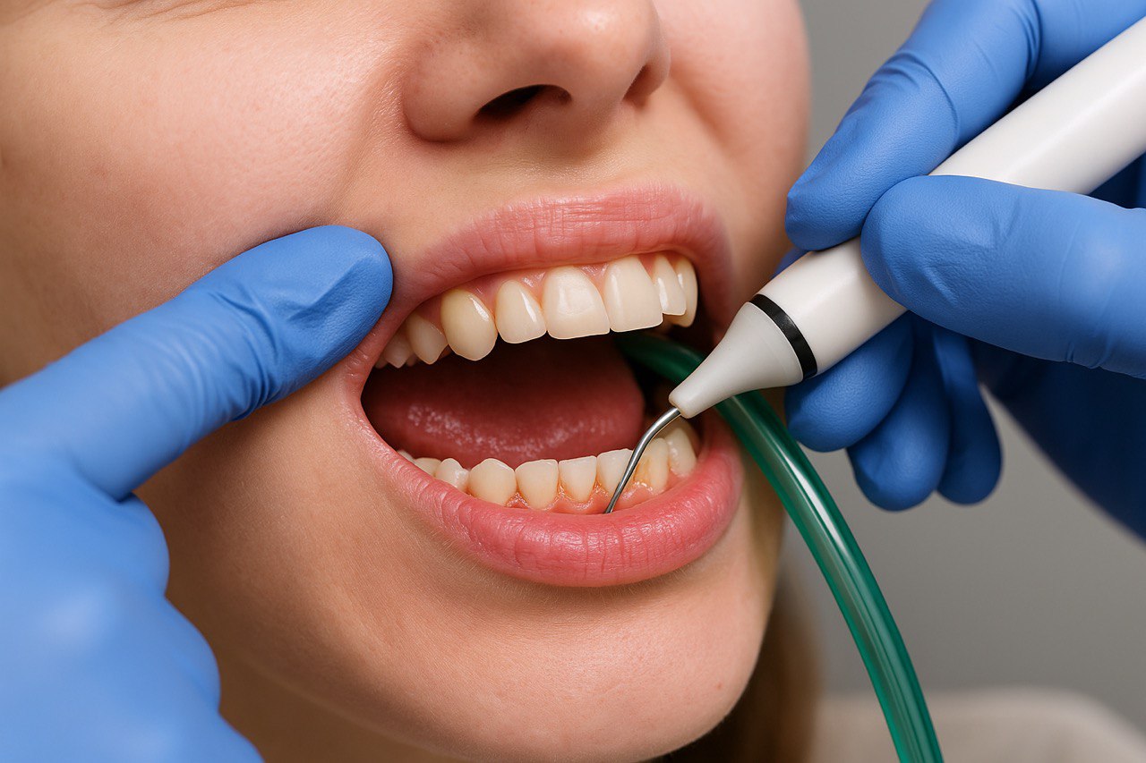 Метод основан на высокочастотных колебаниях (25–42 кГц), разрушающих зубной камень. Во время процедуры подаётся поток воды — он охлаждает рабочую зону и смывает удалённые отложения. Дополнительный плюс — кавитационный эффект оказывает антибактериальное действие.